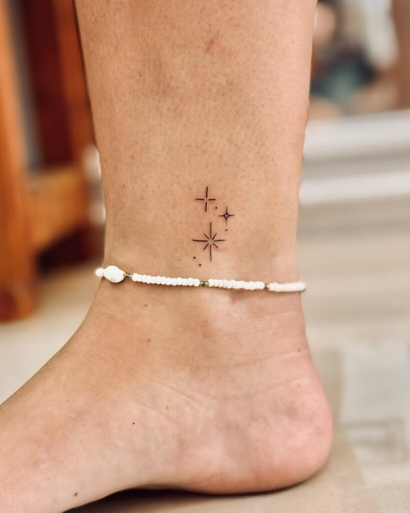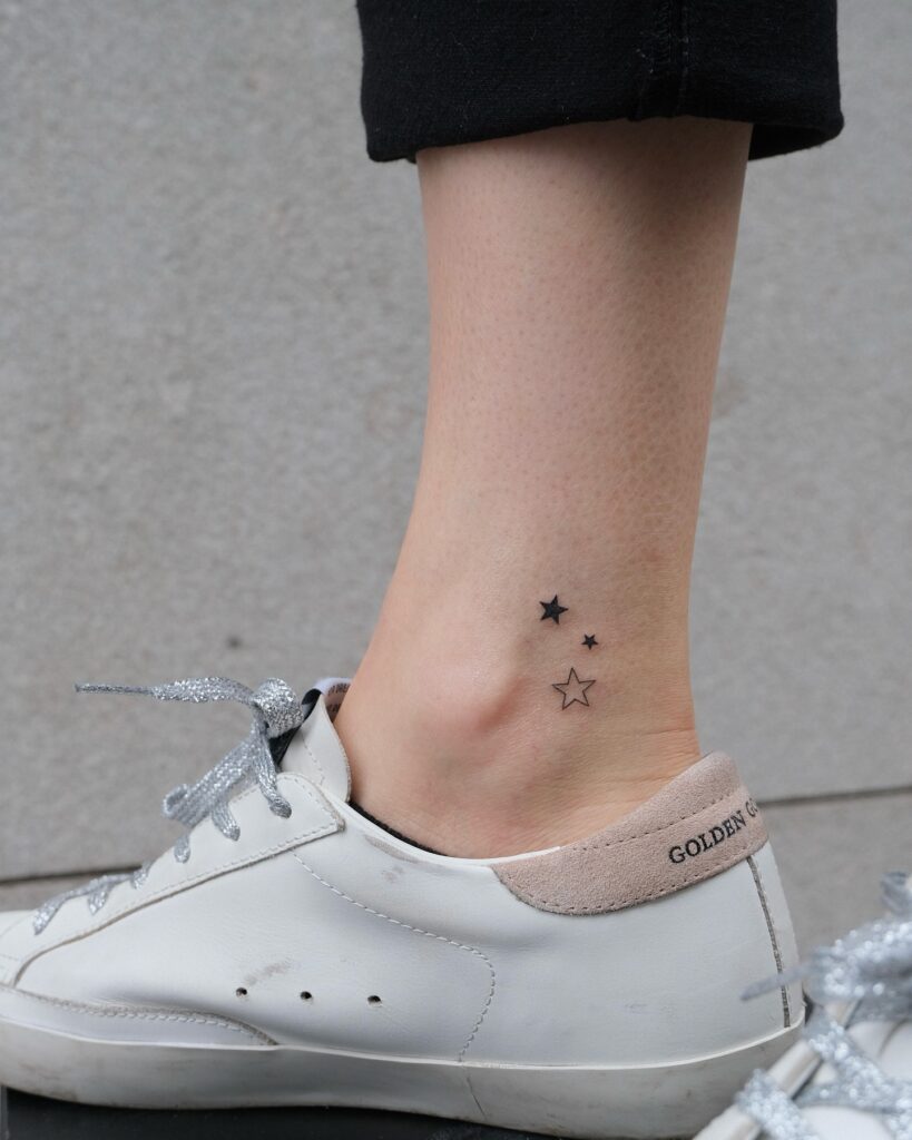 This design features three small stars tucked right behind the ankle bone. I love how it mixes a solid black star with a tiny one and a simple outline.