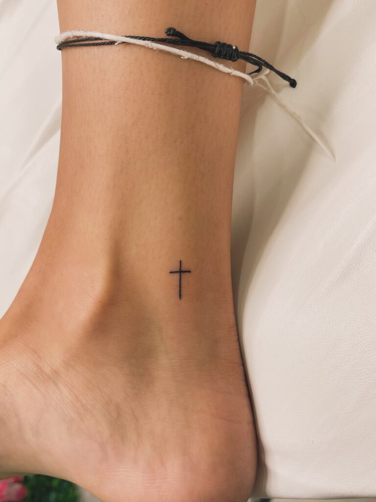 Sometimes the smallest symbols carry the most weight. This tiny cross is actually a very popular choice for the inner ankle.