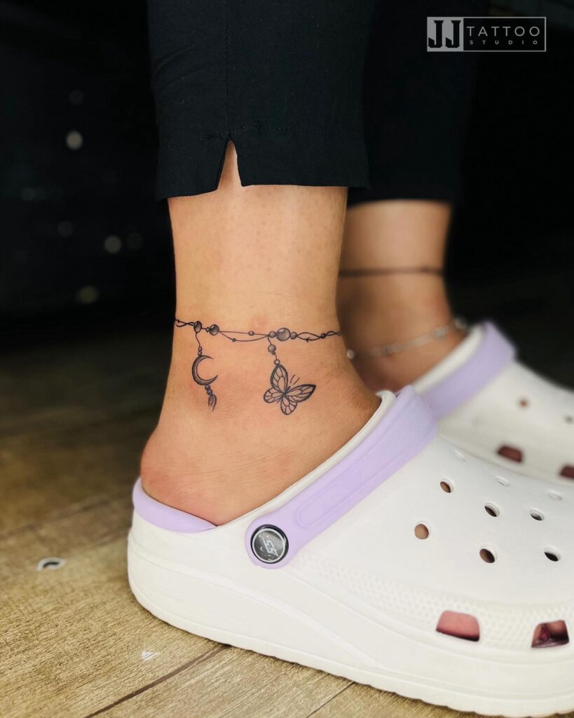This tattoo looks exactly like a real silver anklet. The way the crescent moon and butterfly hang from the “chain” is seriously impressive.