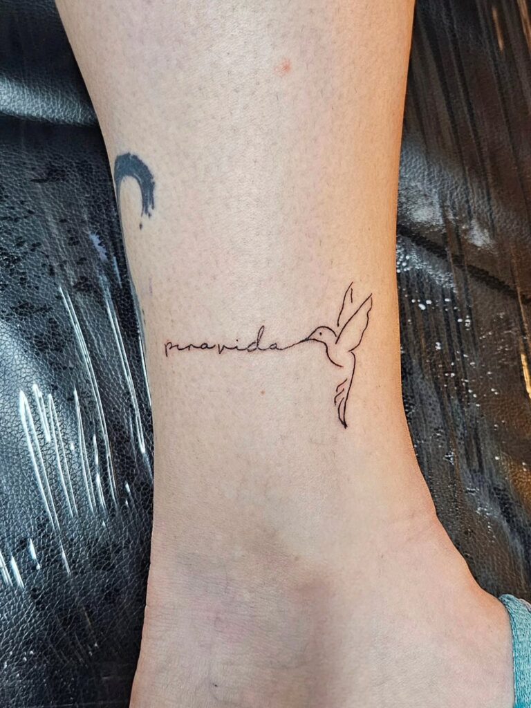 This tattoo is the perfect mix of word art and illustration. I feel like the fine line connecting the bird to the text is exactly what makes it flow so well.